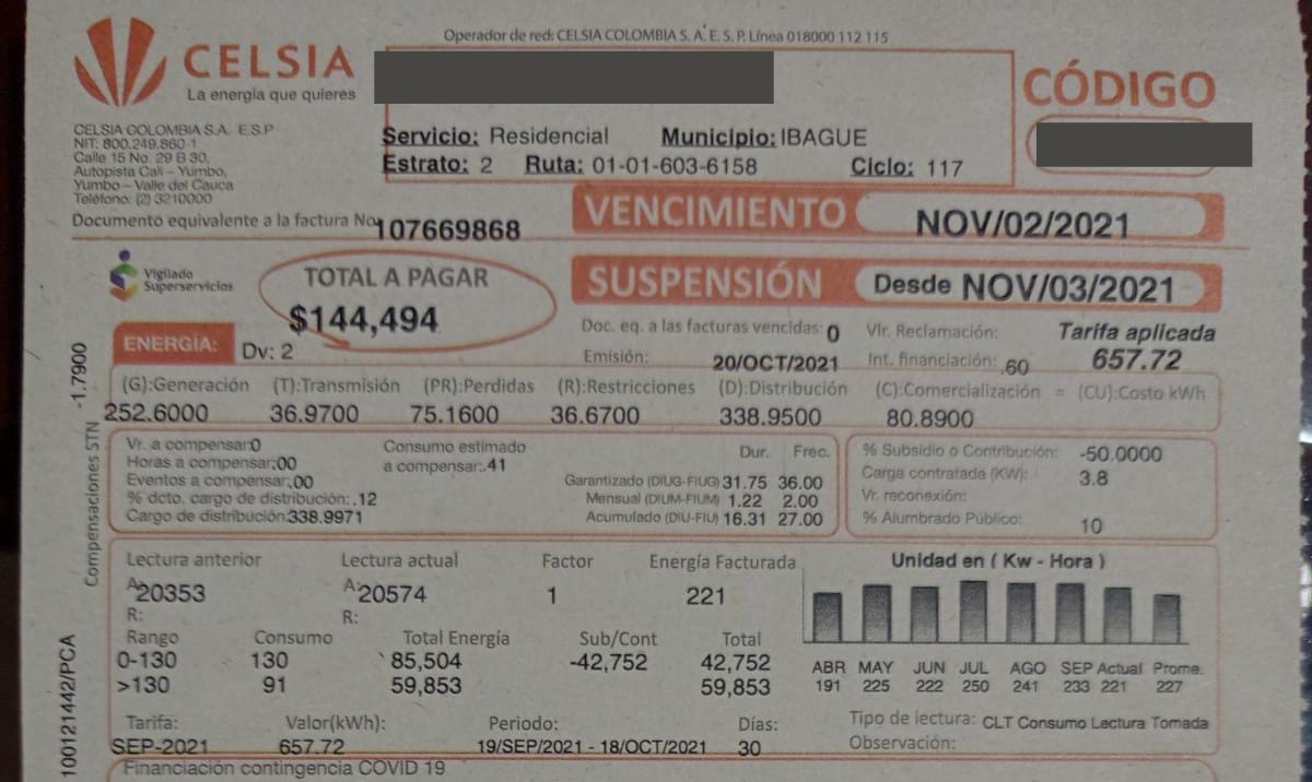 Otro usuario estrato 2 del barrio Praderas del Norte, también de Ibagué, indicó que en su más reciente factura del mes de octubre, el kilovatio le fue cobrado a 657 pesos, y no a 521 como dice Celsia.