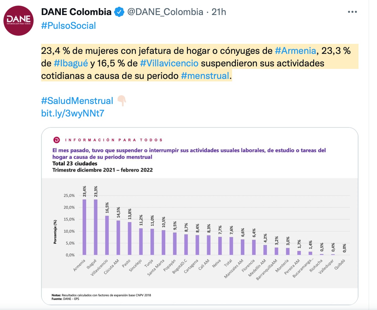 En uno de los mensajes por su red de twitter la entidad señaló que el 23,4 % de mujeres con jefatura de hogar o cónyuges de #Armenia, 23,3 % de #Ibagué y 16,5 % de #Villavicencio suspendieron sus actividades cotidianas a causa de su periodo #menstrual.