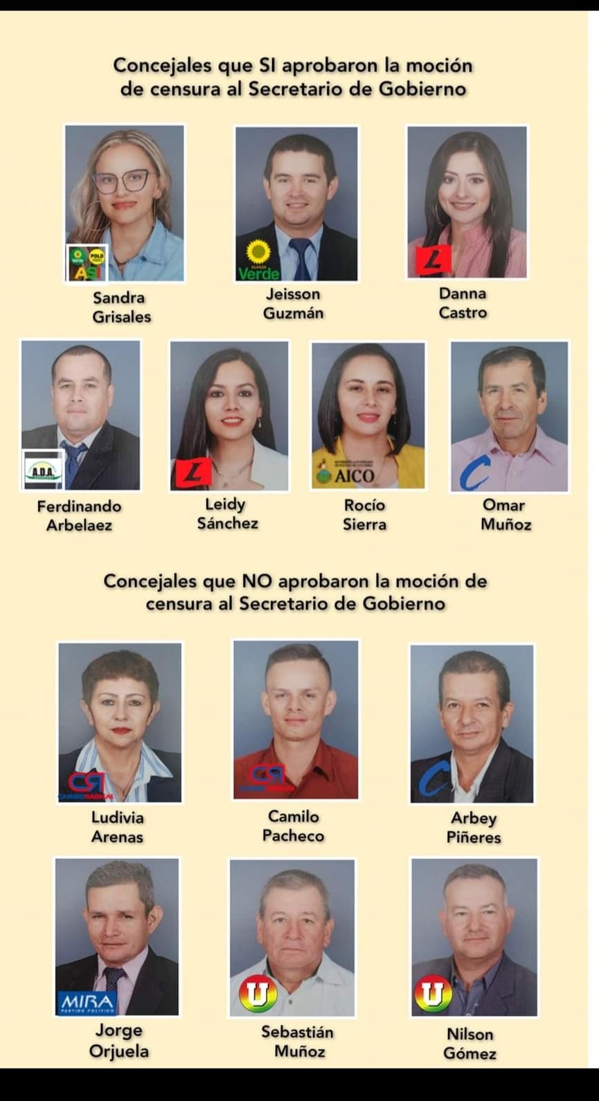 Faltaron dos votos para hacer efectiva la moción de censura contra el secretario de Gobierno, Douglas Quintero. Siete de los 13 concejales votaron a favor de la moción de censura, mientras 6 votaron en contra. Se necesitaban nueve votos para surtir el trámite. Pese a seguir en el cargo, su legitimidad queda resquebrajada.
