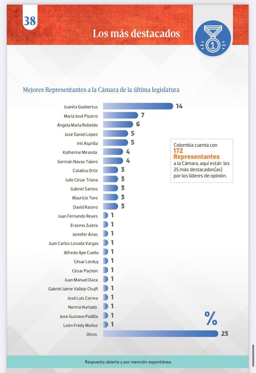 Le siguieron los representantes María José Pizarro, Ángela María Robledo, José Daniel López e Inti Asprilla. Entre los 25 destacados no aparece ningún representante por el Tolima: Ricardo Ferro, José Elver Hernández 'Choco', Adriana Magali Matiz, Jaime Yepes, Aquileo Medina ni Ángel María Gaitán.